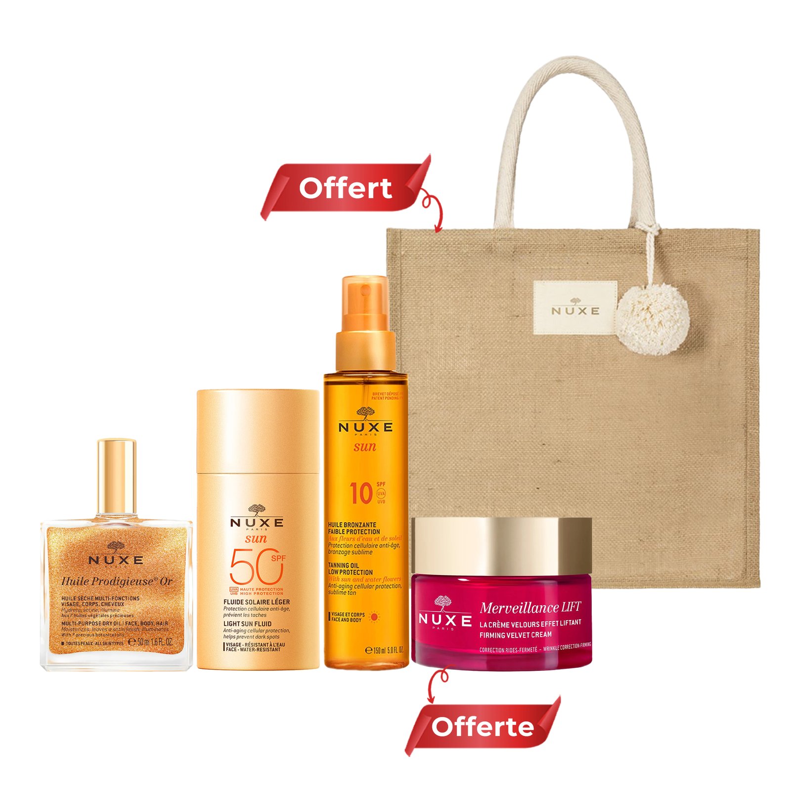 NUXE Sac Huile Prodigieuse Or 50 ml& NUXE Fluide Solaire Léger SPF 50 & NUXE Huile Bronzante SPF 10 & NUXE Merveillance LIFT La Crème Velours Offerte