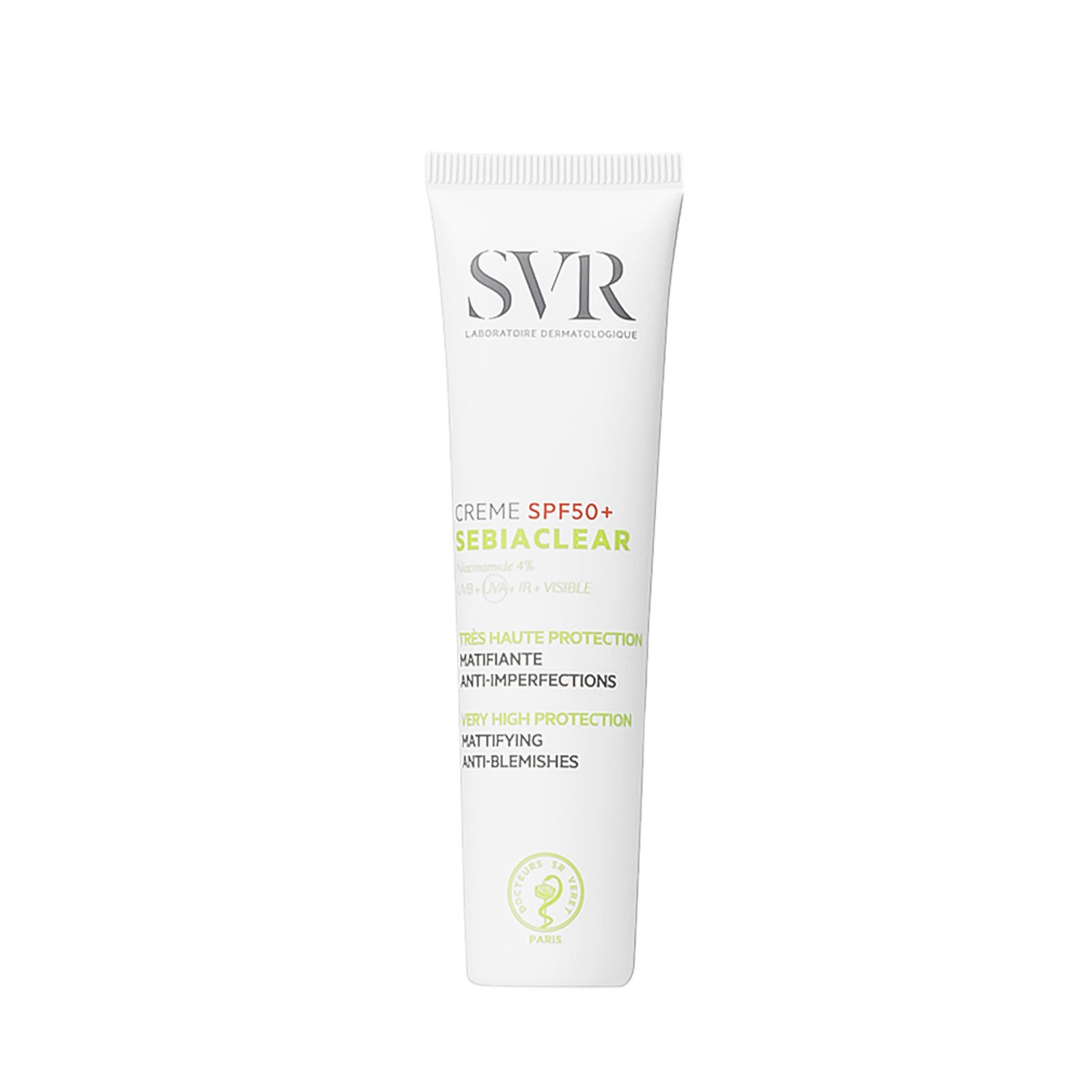 SVR Sebiaclear Crème SPF50+ est une crème solaire matifiante et anti-imperfections qui offre une protection solaire très haute contre les UVA, UVB, infrarouges et lumière visible, tout en réduisant les imperfections et les points noirs, en matifiant la peau et en prévenant les marques brunes ou rouges. Sa formule unique, à base d’actifs brevetés et d’ingrédients respectueux de la peau et de l’environnement, est idéale pour les peaux grasses à imperfections.