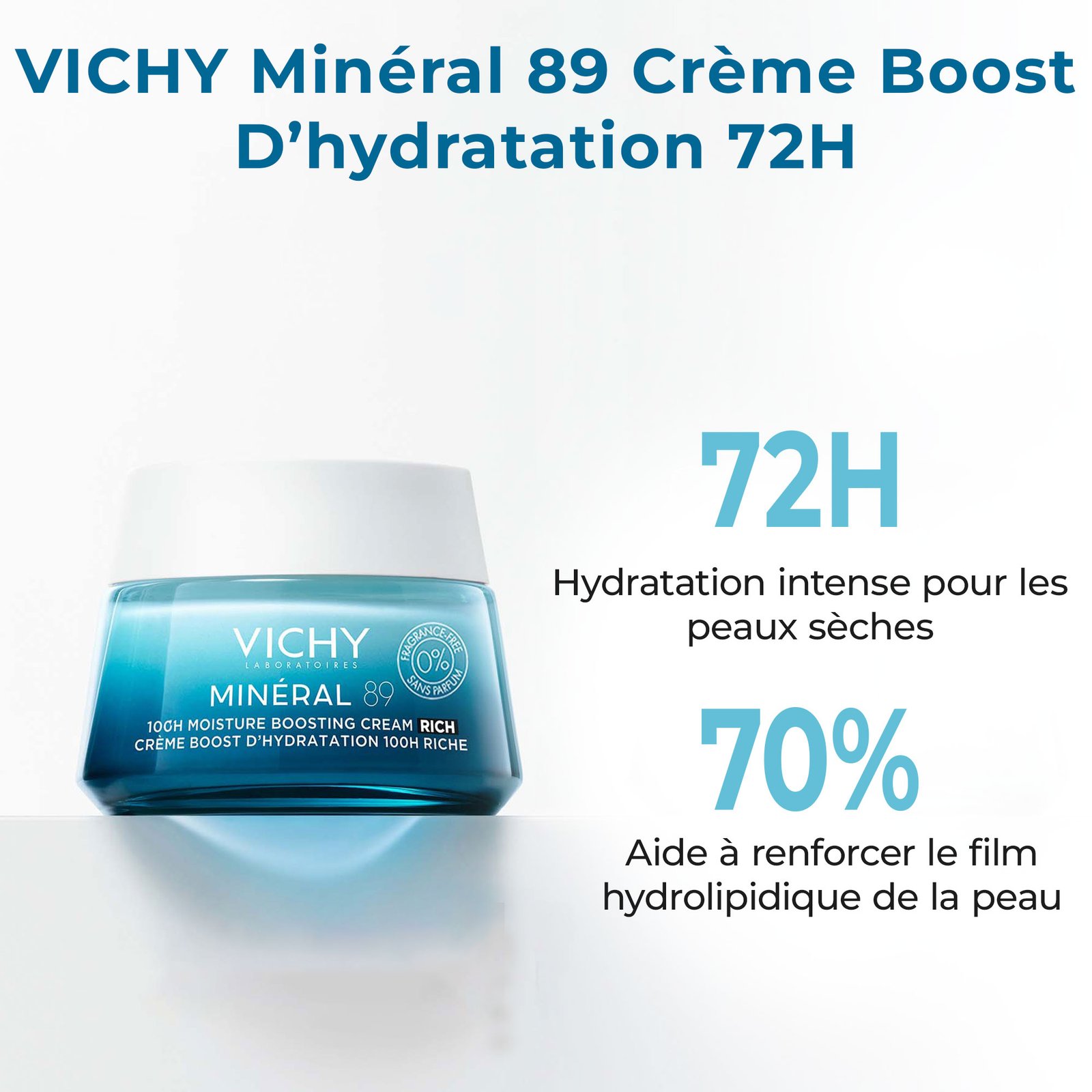 VICHY Minéral 89 Crème Riche Boost d’Hydratation 72H est une crème hydratante intense spécialement formulée pour les peaux sèches. Elle contient de l’acide hyaluronique pur, des minéraux volcaniques de VICHY, du squalane et des vitamines B3 et E pour hydrater pendant 72 heures, renforcer la barrière cutanée, nourrir et apaiser la peau.